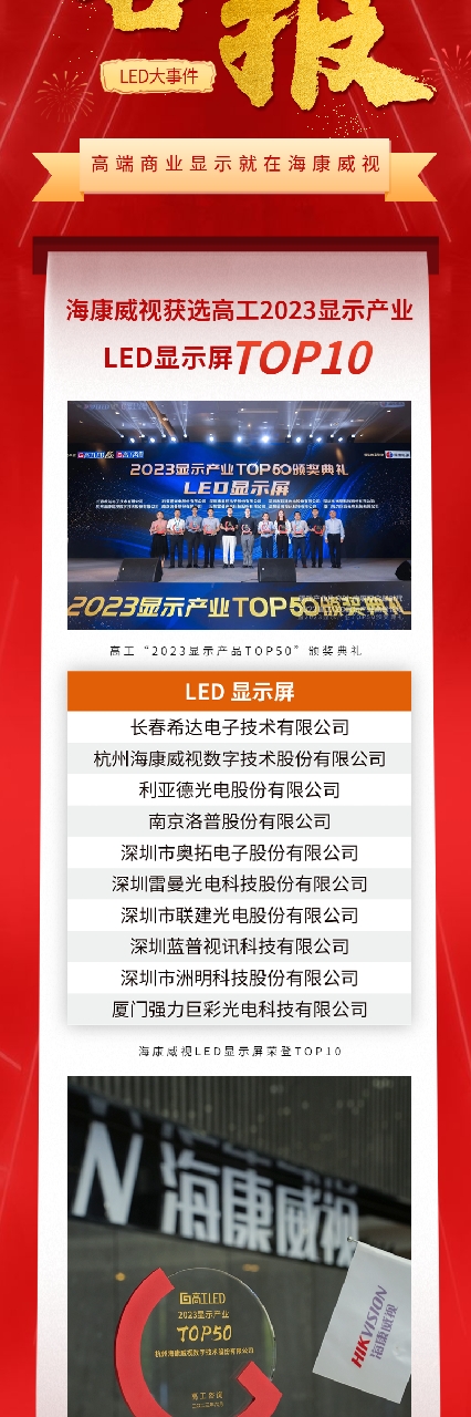 为了表彰在LED和显示领域的优秀供应链企业和具备突出贡献的产品 / 技术,2023年,行家说产业研究中心启动「行家极光奖」评选。经过数月紧张的评选,海康威视荣获多项大奖LED显示屏营收TOP10、优秀项目案例TOP10、显示屏产品TOP10!