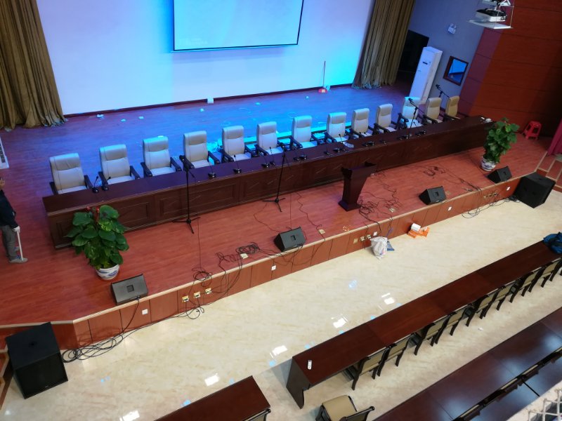 主要设备包含音响扩声系统、功放、调音台、音频处理设备等核心设备 多功能会议室既要满足会议扩声,同时又要兼备活动的功能,为了满国家标准足音乐声压级及语言声压级98dB,一般采用全音域音箱,在小会议室选择了专业会议柱形全频音箱做为主扩声音箱,具有人声、音乐还原真实、音质清晰、杂音小等特性,有良好的美观性、隐藏性,符合高标准的装饰要求。大会议室则选用了专门针对有高音色要求的高级场所的专业音箱。,音箱中高频突出,声音细腻,既可满足会议,又可以满足多功能活动娱乐,满足国际标准声压级93DB的标准,既能满足整个厅堂的语言扩声,又能满足音乐扩声。