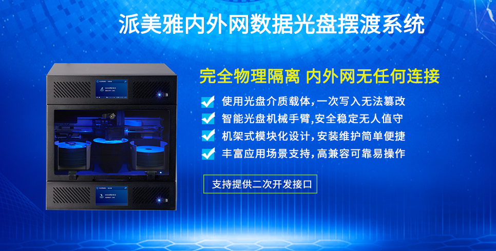 派美雅作为专业的光盘打印、刻录、数据分发、数据摆渡行业等创新产品研发、生产、销售、售后四位一体的厂商。针对于网络单导、离线单导、数据交换等业务应用场景的需求和痛点,派美雅按需推出内外网数据全自动光盘摆渡系统是一款软硬一体的数据单向导入/导出光盘摆渡系统面向高安全数据传输场合,在不改变现有网络物理隔离要求,使用光盘介质为载体,一次写入无法篡改。集数据自动摆渡、用户管理、审批、安全审计、加密及病毒查杀、日志管理等功能于一体,利用智能机械手臂,实现光盘在光驱、盘仓间的自动流转,最终实现将数据从一个网络传递到另一个网络,完全物理隔离,内外网无任何连接。