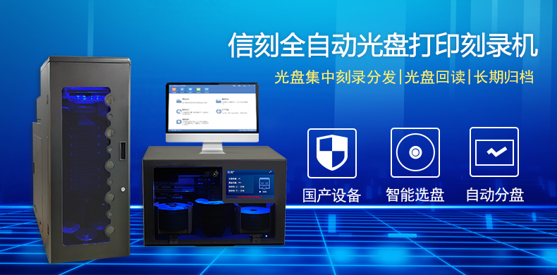 信刻国产网络蓝光光盘打印刻录一体机,面向公检法司、公共资源交易中心、档案行业、政企单位等行业领域,解决数据光盘刻录备份过程中遇到的问题和需求,采用全新的设计理念,模块化易用性设计,支持多种介质光盘智能选取,满足大数据环境下用户可根据不同的数据量与光盘刻录量选择需求。