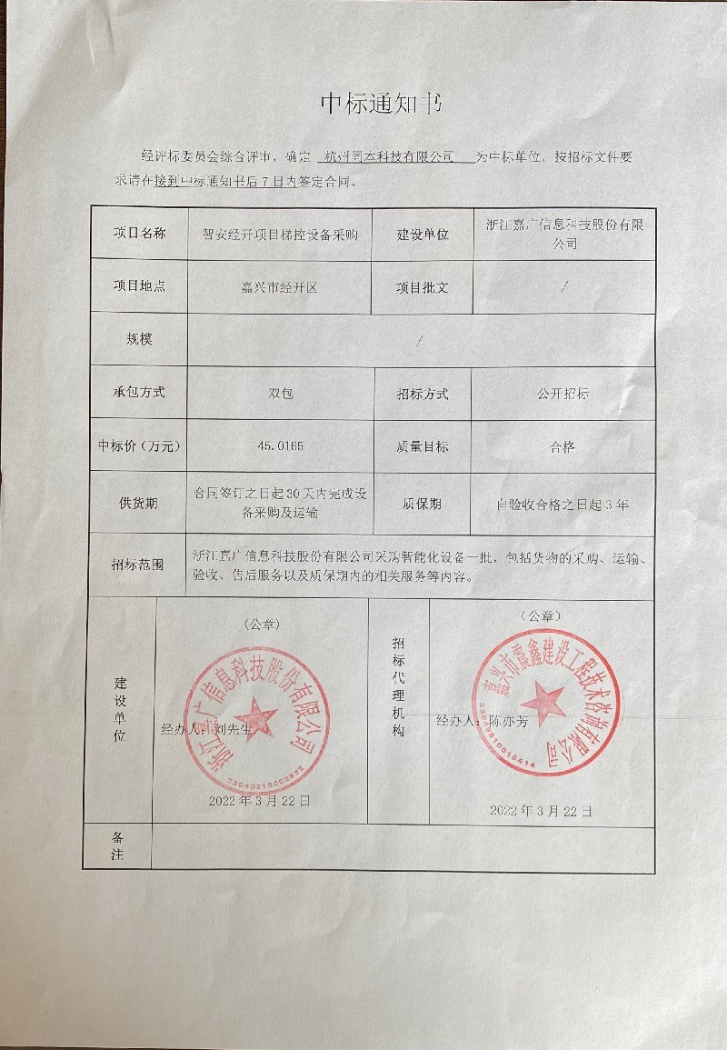 杭州同本科技有限公司中标智安经开梯控设备采购项目;