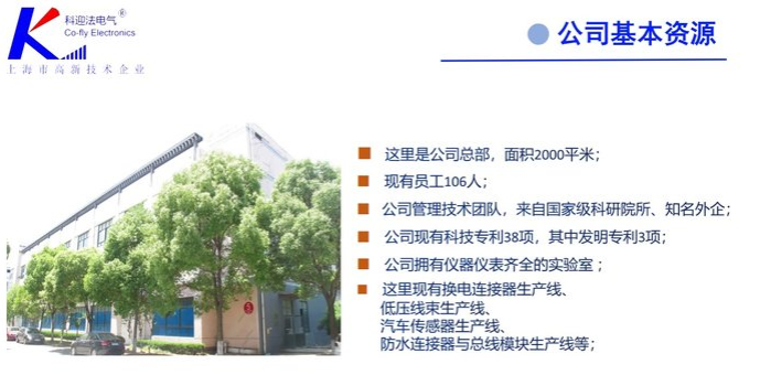 上海科迎法电气科技有限公司,成立于2009年4月,上海市高新技术企业,成功通过环保局环评验收,现有21项科技专利,是上海市科委科技创新立项单位,公司通过ISO9001:2015体系认证,产品通过CE、IP67防护、REACH191认证,产品符合SGS、ROSH指令要求。我们公司还通过中国制造TUV供应商现场认证。产品的质量可靠性与技术标准已达到国际、国内技术先进水平。 我们公司位于上海市松江高科技工业园涞寅路1881号5号楼(距离上海虹桥机场仅15分钟左右的车程)。 我们公司管理团队、技术团队来自于原国家的科研院所,跨国企业等, 拥有丰富的科学精益的企业管理经验。资深的技术团队拥有丰富的电气连接与传感器技术研发、生产工艺技术。我们公司现有研发工程部、质量管理部、采购部、市场营销部、人力资源部、财务行政部 、 工控产品事业部、汽车传感器事业部、新能源汽车产品事业部等。我们公司的愿景:做可靠连接与信任的高科技公司;我们公司的价值观:创新、高效、优质、诚信、爱心。我们公司的专业方向:专注于电气连接与传感技术解决方案。 我们公司产能现有: 工控自动化产品生... [详细介绍]
