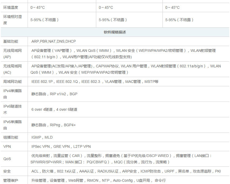 | 安全 | ACL,防火墙,802.1x认证,AAA认证,RADIUS认证,ARP安全,ICMP防攻击,URPF, | |||||||