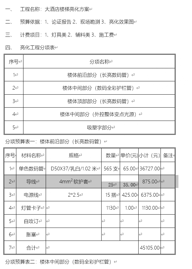 亮化工程预算表(部分截图)