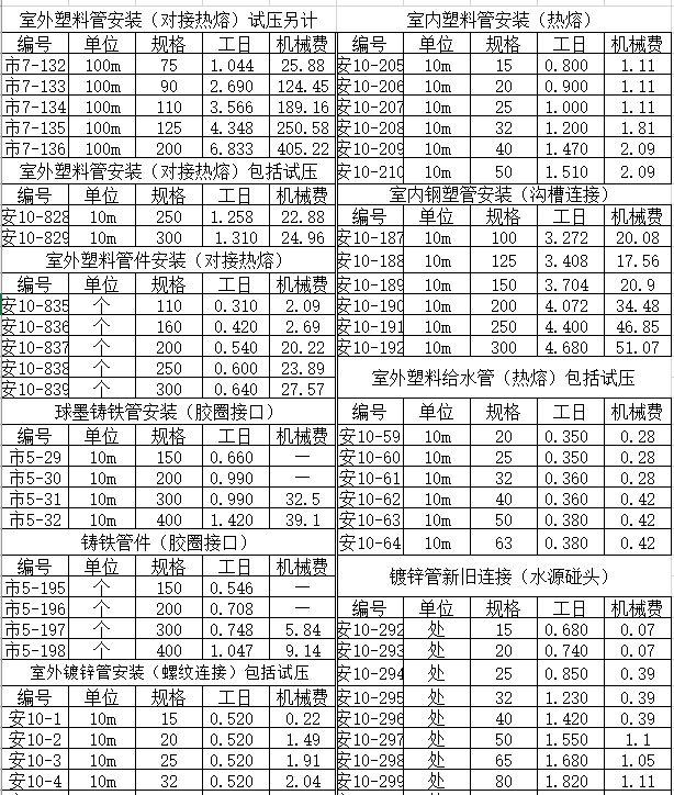 这个是对于各类管的施工定额报价,按工日计算,以下面为部分报价内容,下载后,即可获得excel详细版本定额报价。