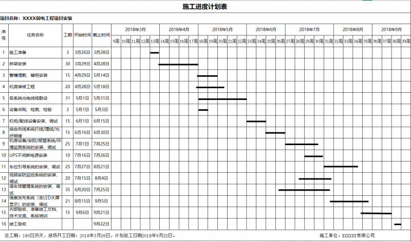弱电智能化停车场施工进度表,专门为智能化停车场制定的施工进度表,方便大家在项目工程时可以直接套用。