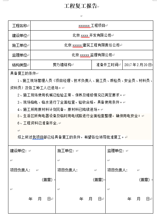 工程复工报告