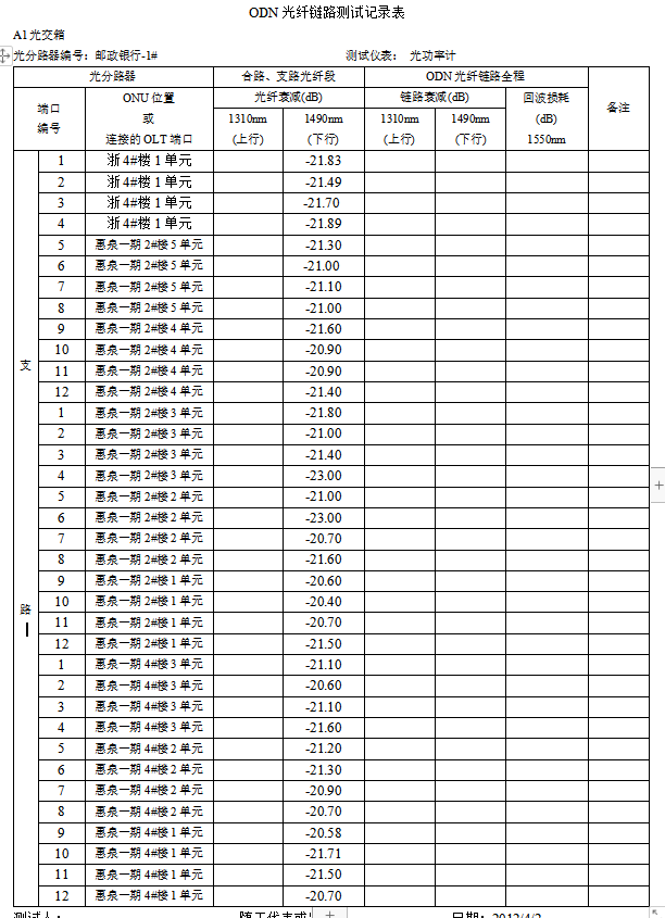 ODN光纤链路测试记录表