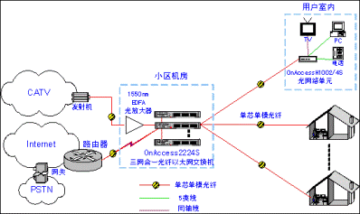 3) 光分配网:是无源光网络的另一种称呼,由馈线光缆、光分路器、支线光缆组成的点对多点的光分配网络,简称ODN。