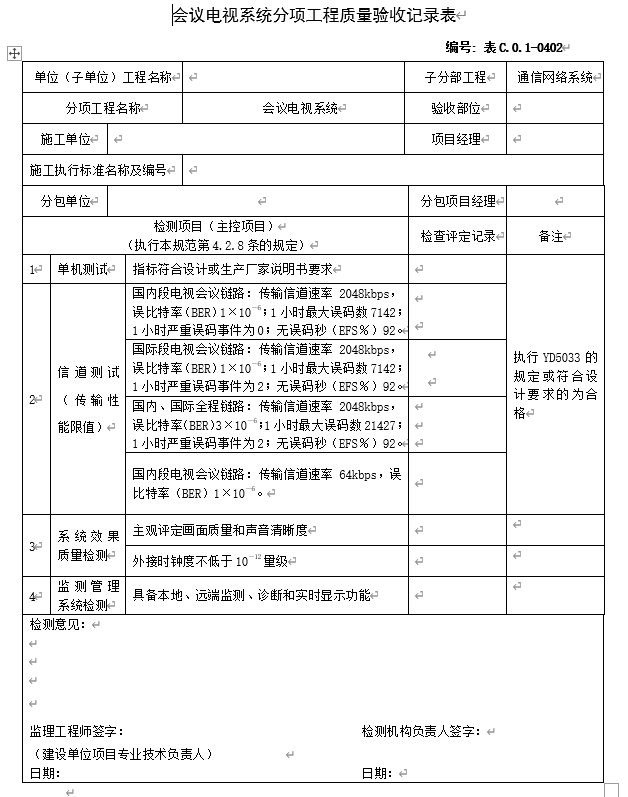 会议电视系统分项工程质量验收记录表