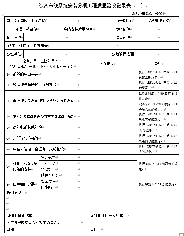 综合布线系统安装分项工程质量验收记录表(Ⅰ)