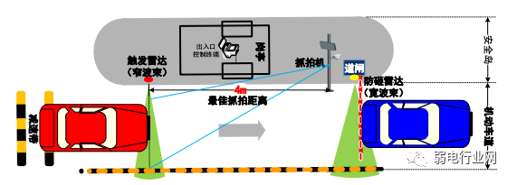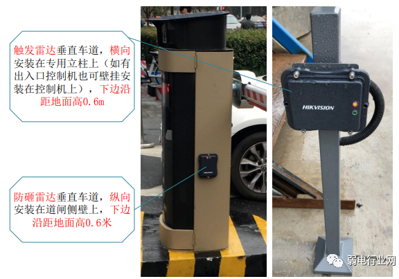 2、防砸雷达在自动挡车器杆子起落方向的机箱侧面,正对车道,壁挂式安装。