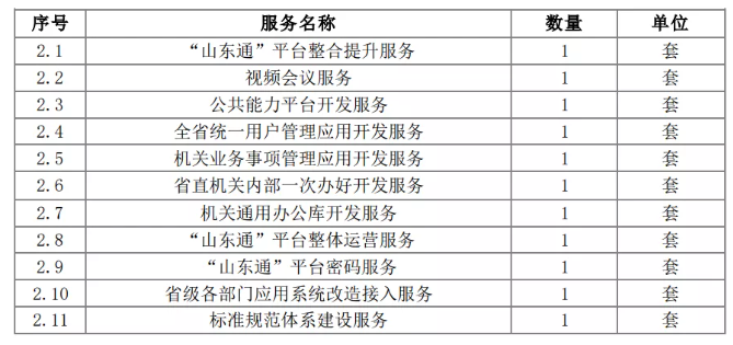 项目概述:本项目为购买服务的方式,服务内容包括 “山东通”平台整合提升服务、公共能力平台开发服务、视频会议服务、全省统一用户管理应用开发服务、机关业务事项管理应用开发服务、省直机关内部“一次办好”开发服务、机关通用办公库开发服务、“山东通”平台整体运营服务、“山东通”平台密码服务等服务内容。