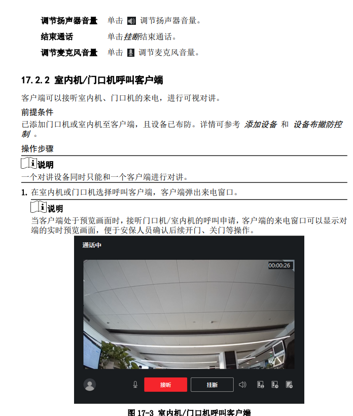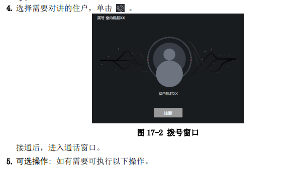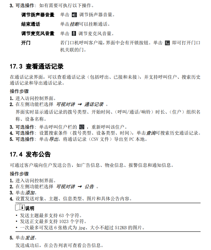 客户端支持可视通话,为提高安全性和效率,可以对呼叫用户、通话记录和对讲信息等功能 进行管理。 管理可视对讲之前,请先配置可视对讲设备和人员。具体请参考 添加设备 和 人员管理 。 17.1 操作流程 首次使用,建议按以下顺序进行配置和操作。