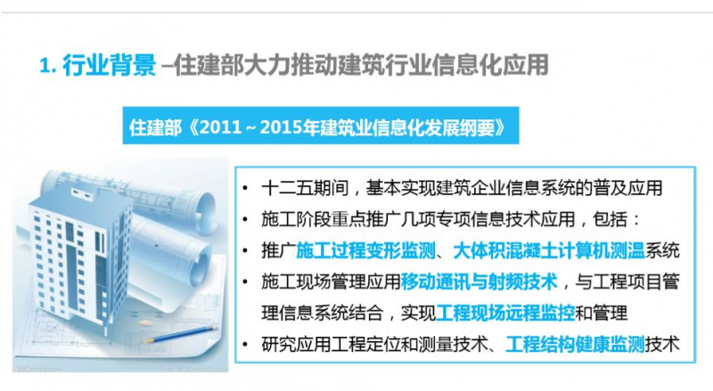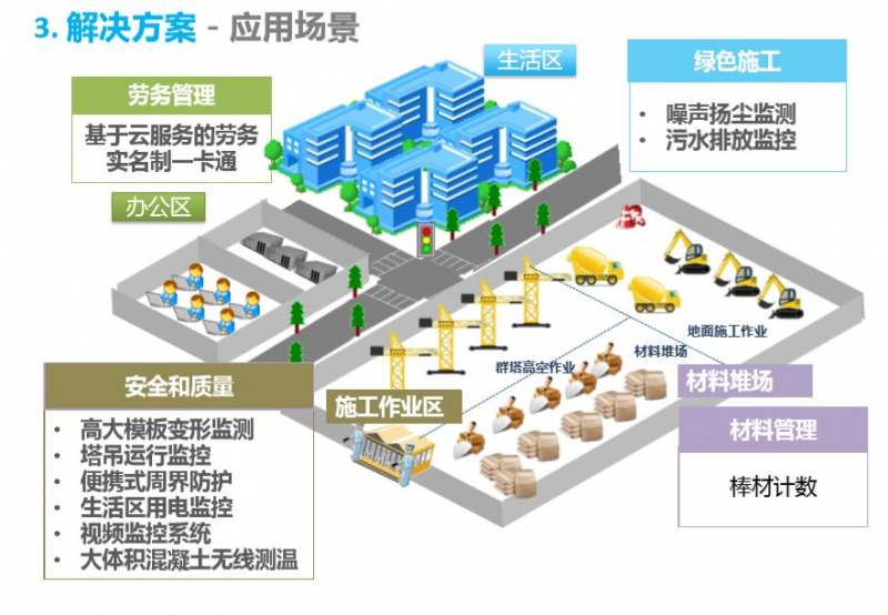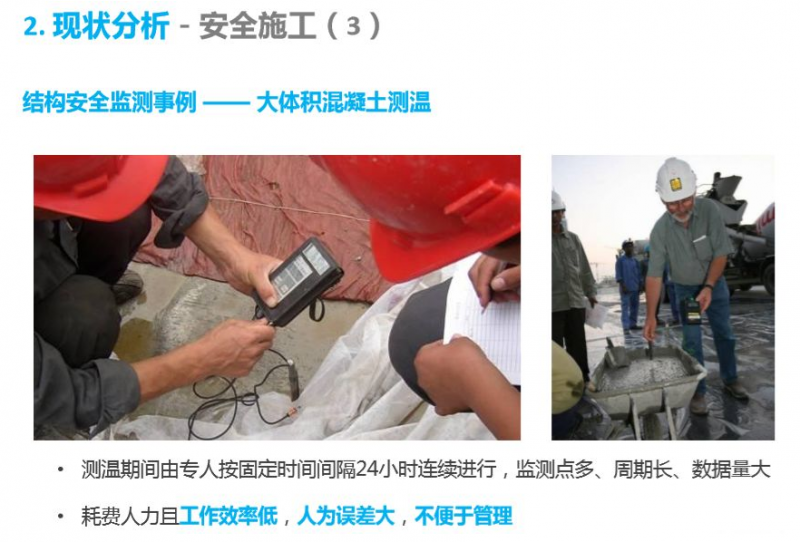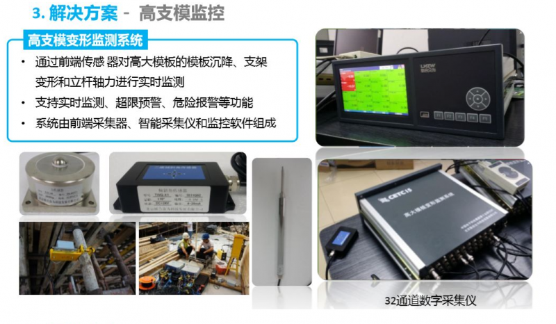 33 | 4 | 混凝土测温 | 大体积混凝土测温子系统能够有效探测混凝土内外不同层面之间的温度,为施工班组提供混凝土浇筑后的真实温度数值,帮助提升混凝土浇筑质量,保证工程整体施工质量 | √ | √ | √ | √ | ||||||