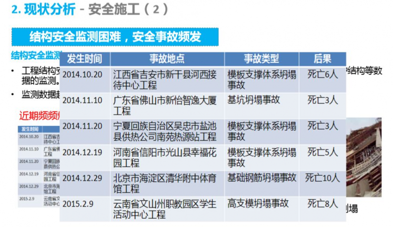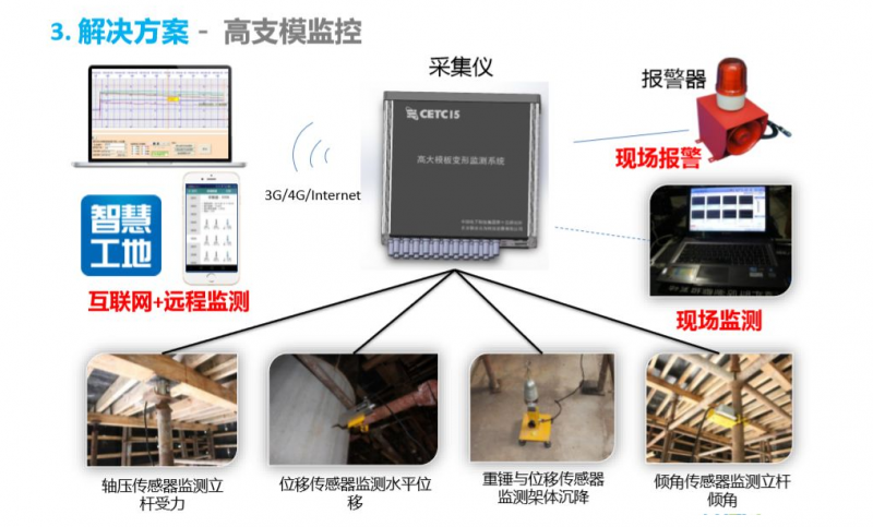18 | 15 | 脚手架载重/角度/位移监测 | 重力实时监测模块、预警控制模块、异常报警模块和施工方案调整模块等,通过无线组网和压力传感器装置随时监测脚手架架体的压力变化、倾斜角度变化、位移变化等非常规性的变化。一旦有异常变化发生,系统就会自动报警,提示负责人进行施工方案的调整 | √ | √ | √ | √ | ||||||