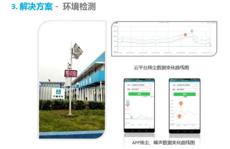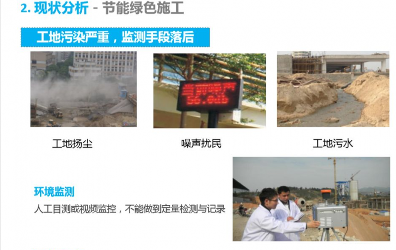 23 | 20 | 扬尘噪音监测 | 扬尘噪声监测系统依托自动化监测设备,可对施工现场区域环境的空气及噪声进行实时监测,其中室外环境监测设备可对噪声、颗粒物浓度(PM2.5、PM10)、风向、风速、湿度、温度、大气压等多项环境参数要素进行全天候现场精确测量与LED屏实时显示 | √ | √ | √ | √ | ||||||