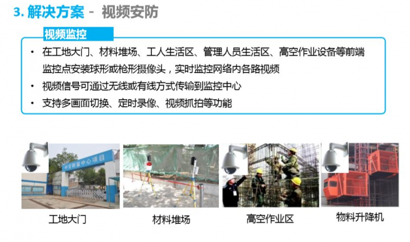 4 | 安全管理 | 1 | 智能视频监控 | 可应用于项目施工、质量、安全、文明施工管理等方面,管理者可及时掌握施工动态,对施工难点和重点及时监管。监控范围全面覆盖现场出入口、施工区、加工区、办公区和主体施工作业面等重点部位 | √ | √ | √ | √ | |||||