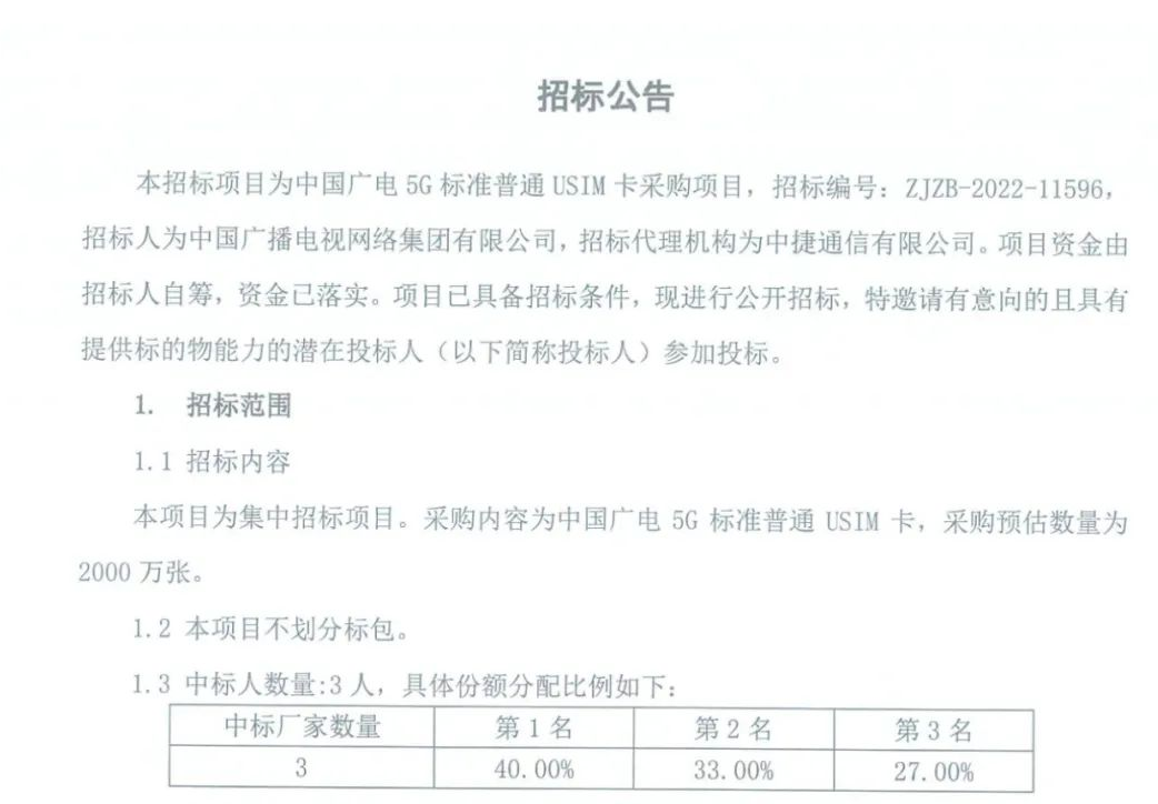 3月24日,中国广播电视网络集团有限公司启动《中国广电5G标准普通USIM卡采购项目》招标,采购预估数量为2000万张。