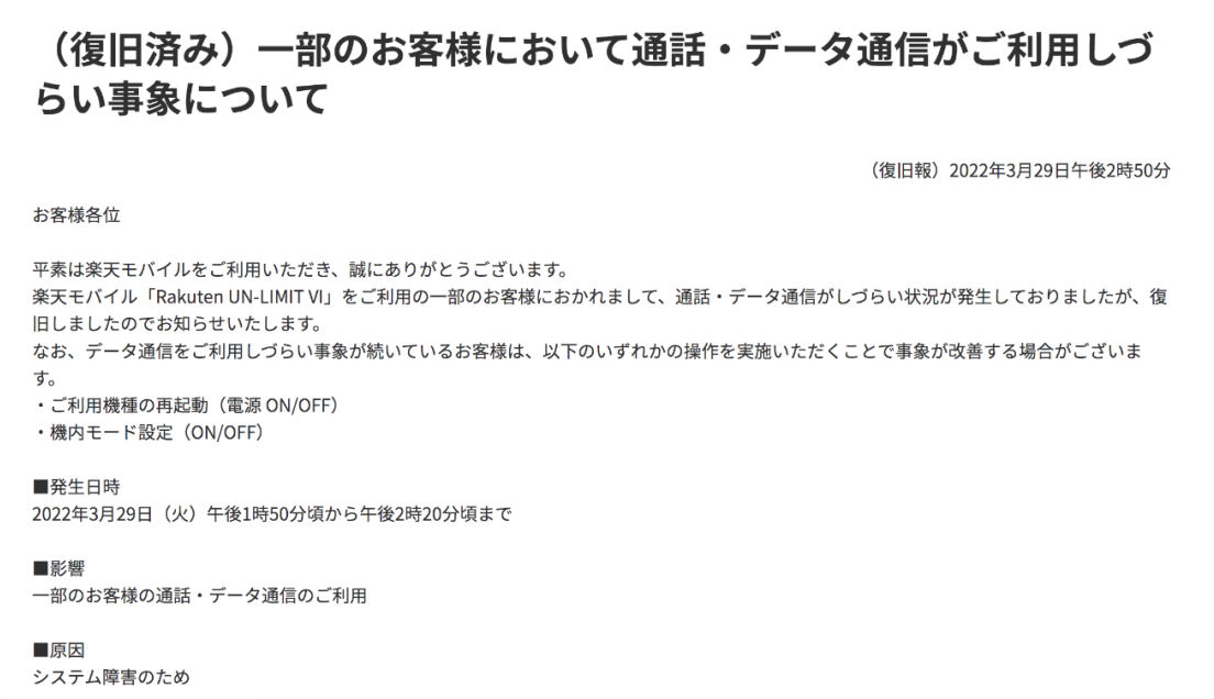 事故发生后,乐天移动网络下的部分手机显示“圈外”,即不在服务区、没有信号的意思,不少用户在社交网络上抱怨不能上网、无法完成手机支付,甚至错过了面试电话。下午2:50,乐天移动发布网络故障通报,表示该故障于下午2:20恢复,故障原因为“系统故障”,并告知用户,如果仍无法上网,请重启手机,或开关飞行模式。尽管此次故障只持续了30分钟,但由于发生在白天,影响较大,同时,考虑乐天移动作为一家全虚拟化移动网络运营商,一直在对外宣称其全自动化网络运营优势,因此本次事故引起了业界关注。