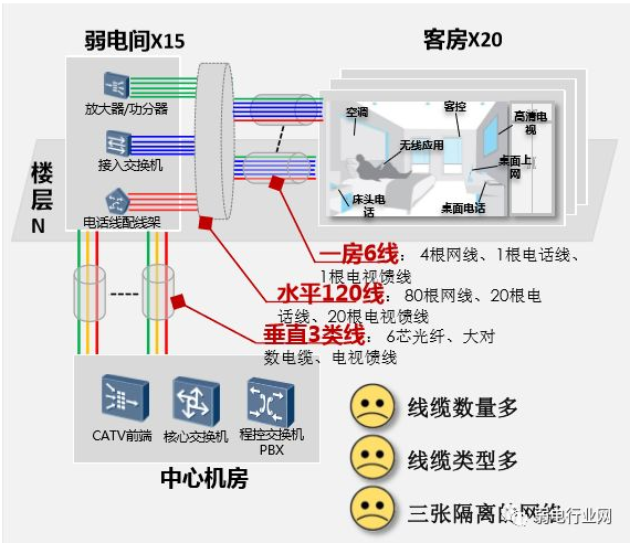 传统酒店的就是“一房多线”,一个房间线缆众多,酒店客房一般业务系统多,所以部署复杂,弱电人员增加了很多工程量,而问题也没有得到好的解决。