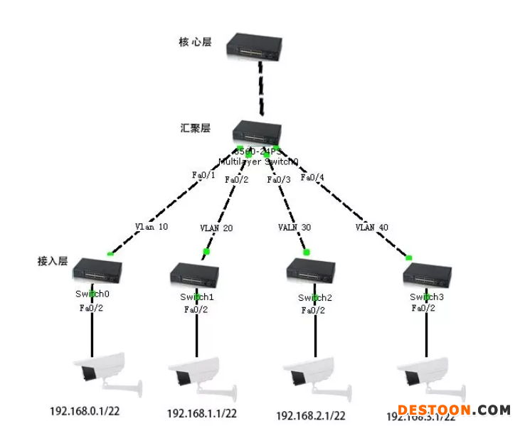 这里面每个VLAN都可以容纳250个点位以上,四个网段共有1000 ip地址可以使用,是完合足够分配每个区域的ip地址的,另外,后续每个区域若有增加点位,都是有足够的预留,值得注意的是,这里面接入层交换机是需要合理的分配,接入层交换机的选择,我们之前有提到过,这里不做过多说明。
