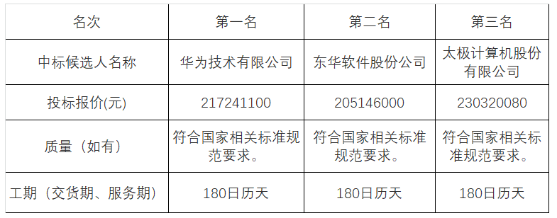 备注说明:第一名:华为技术有限公司(联合体牵头人)、软通智慧信息技术有限公司(联合体成员);第二名:东华软件股份公司;第三名:太极计算机股份有限公司