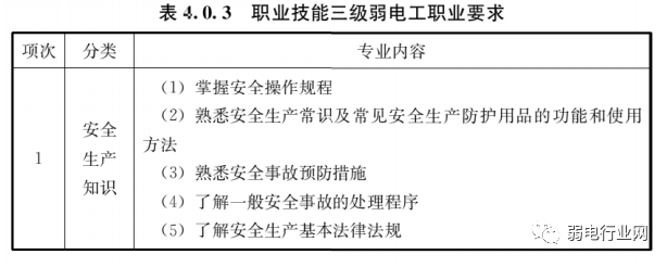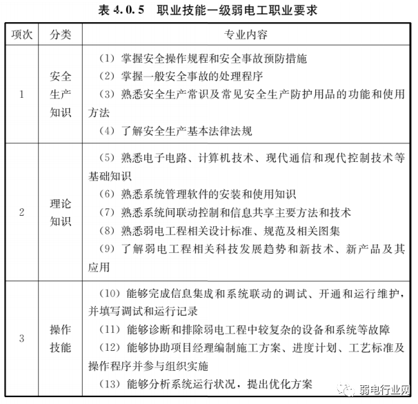 我们来看下《JGJ/T428-2018弱电工职业技能标准》中的对弱电职业技能的五个等级划分内容。