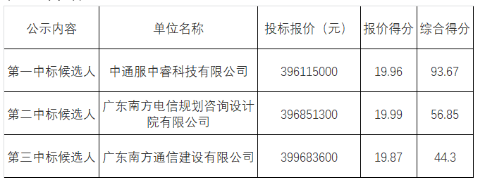 中标候选人第一名:中通服中睿科技有限公司 ,