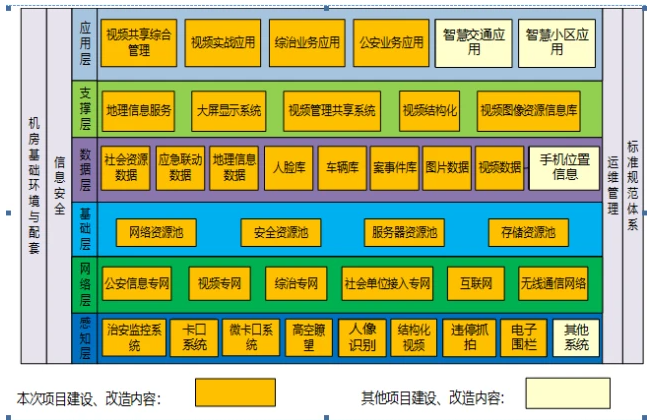 (1)感知层:包括治安监控系统、卡口系统、微卡口系统、高空瞭望摄像机、人像识别、结构化视频、违停抓拍、电子围栏等;