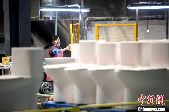 3月13日,在九牧永春智慧制造产业园区101#智慧工厂,工人在检验机器人生产的洁具。 康庆平 摄