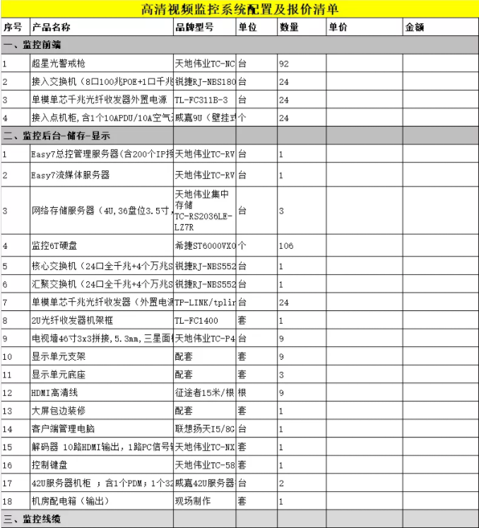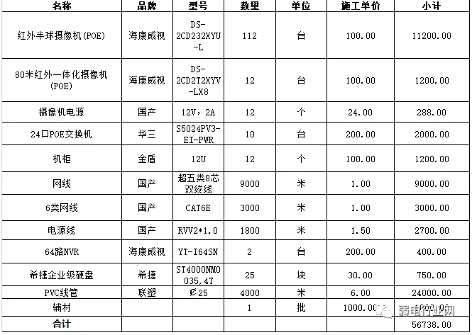 在监控报价之前,我们需要根据图纸或者项目情况,列出项目的工程量预算清单,清单中包括设备列表、型号、参数、设备数量、施工报价、税点等。