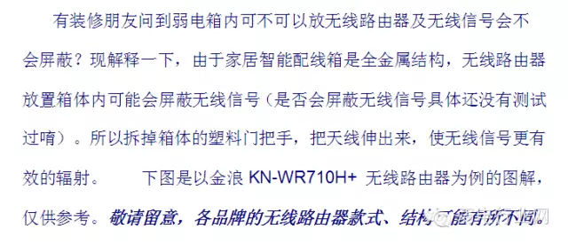 2、 在安装弱电箱的时候,业主最好将弱电箱箱体底板和盖板先拆下来妥善保存好。先只给一个空的弱电箱体给电工预先埋入墙体和布线。待整个装修工程接近完工时,再将弱电箱箱体底板、盖板/路由器、猫和接口模块装上去,完成模块的接线工作。