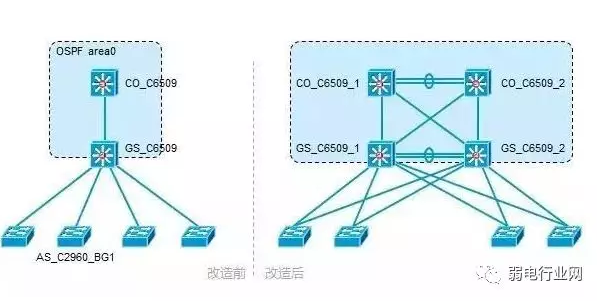 一个网络在改造前,网络结构见“改造前”,可 以看得出,网络结构比较简单,而且存在单一设备、单一链路的缺陷。设备和链路均没有冗余。那么这个网络运行一段时间后,网络可能会时常出问题,例如接入交换机如果上联链路出现故障,那么整台接入交换机上所连接的用户都无法上网了。于是客户提出网络的改造需求,总体的目标是: