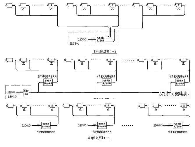 摄像机的供电因地制宜,可采用集中供电,也可以本地供电,视现场情况而定,两者区别如图。