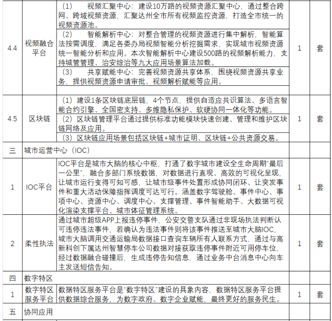 建设内容:本项目建设内容包括但不限于以下内容(以最终需求确认为准):基础设施(智慧云平台、网络系统、安全保障、备份系统)、数据中台、智能中台、业务中台、技术中台(物联网平台、数字孪生平台、融合通信平台、视频融合平台、区块链)、城市运营中心IOC、城市运营中心IOC物理空间,同时在城市大脑底座的基础上打造政务服务、城市治理、城市交通、医疗卫生、应急指挥等试点应用场景和“数字特区”服务平台等内容。