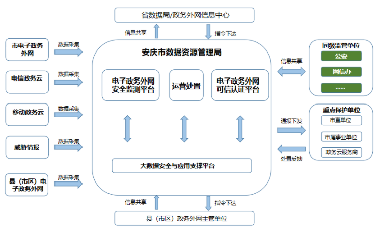 安庆市建成政务外网安全监测平台是为贯彻落实《中华人民共和国网络安全法》、《信息安全等级保护管理办法》、《国务院办公厅关于切实做好各地区各部门政务服务平台与国家政务服务平台对接工作的通知》(国办函〔2018〕59号)、《关于加快推进全国政务外网安全监测平台建设工作的通知》(政务外网〔2020〕1号)及《安徽省数据资源管理局关于进一步加强网络安全工作的通知(皖数资函〔2020〕86号)》等相关要求,能够有效解决当前政务外网面临的紧迫网络安全问题,实现政务外网空间安全治理能力,以及重点行业和政务网络安全防控水平的整体提升,形成覆盖全网、全域、全业务的政务外网安全监测体系,准确把握网络安全风险发生的规律、动向和趋势,形成政务外网和政务云整体安全监测、态势感知、预警通报和应急处置能力,建立常态化安全监测、预警与通报机制,并且完成和安徽省政务外网安全监测平台的对接。