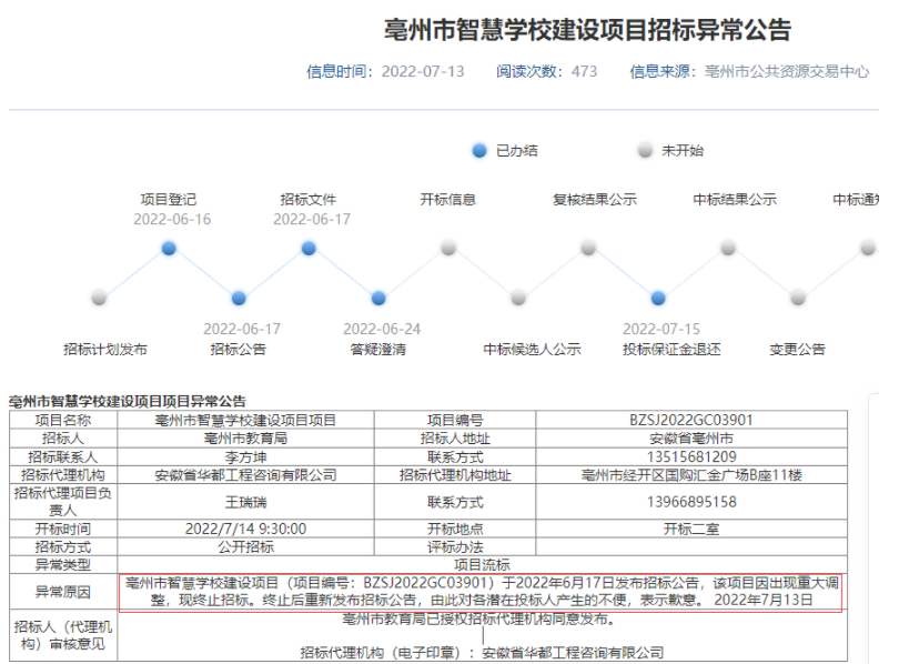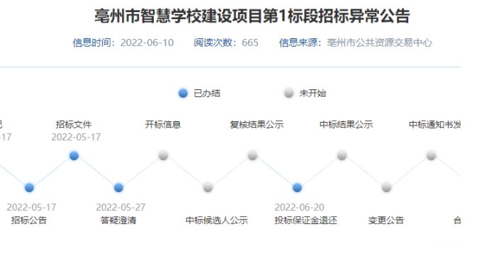 2022年5月17日,亳州市教育局发布《亳州市智慧学校建设项目》招标公告,最高投标限价(招标控制价)187003489.90元。这个项目可谓是一波三折,从5月份开始招标,到8月,三次招标,二次异常而终止招标,最终在8月8日有中标候选人。一、项目情况项目规模:亳州市现有普通中小学校(不含幼儿园)2400多所,班级数量2万多,覆盖