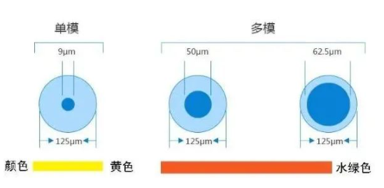 模光纤跳线的护套一般是黄色的,而多模一般是橙色或者所谓的水绿色(就是介于蓝色和绿色之间的颜色);纤芯直径方面,多模的一般情况下要略粗一些。