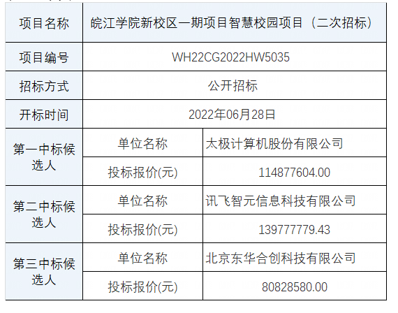 9月27日,安徽省芜湖市皖江学院新校区一期项目智慧校园项目中标结果公告,中标供应商:讯飞智元信息科技有限公司,中标金额:13977.777943万元。建设目标:本项目智慧校园建设要充分考虑建成后系统的运行和管护工作,采用大数据、人工智能、物联网、云计算等技术手段,实现无人值守、远程监管、远程维护、智能自助等管理服务要求,提高系统维护服务效率,降低运行成本。通过智慧校园的建设,构建智慧教学环境、智慧校园管理、智慧校园服务几个领域,建立覆盖整个学校安全、教学、管理、生活、环境等各个方面的综合管理服务平台,实现全校范围的信息共享和业务协同,突出优势互补、集约管理、资源共享的特色,打造国内领先、省内一流的智慧型学校,最终提高学校的核心竞争力。1)基础设施:1.综合布线系统;2.网络系统;3.机房工程;4.云计算系统。2)智慧教学:1.多媒体教学系统;2.标准化考场;3.教学督导及评价;4.电子班牌。3)智慧管理:1.智慧校园平台;2.综合集成管理平台;3.招生管理系统;4.教学资源系统;5.教务管理系统;6.学生一体化管理系统;7.OA办公系统;8.科研管理系统;9.人事管理系统;10.财务管理系统;11.资产管理系统;12.总务管理系统;13.网站管理系统。4)校园服务:1.综合安防系统;2.通道管理系统;3.车辆管理系统;4.无线对讲系统;5.一码通系统;6.公共广播系统;7.公共信息发布系统;8.图书馆数字化管理系统;9.会议室、运动场馆音视频系统;10.能源监控管理系统;11.教室照明及空调节能系统;12.楼宇设备及环境管理系统。中标候选人公示期间讯飞智元信息科技有限公司投诉,太极公司所投CS16809核心交换机不符合《电信设备进网管理办法》要求,投诉事项成立,由招标人根据原评标委员会复核意见,取消太极公司第一中标候选人资格。