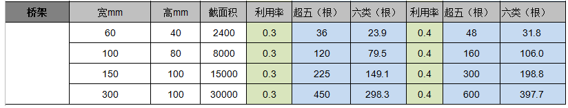 常用桥架的利用率,这里举了一些常见的。在了解桥架的利用率之前,我们可以先了解下超五类线与6类线的芯径。