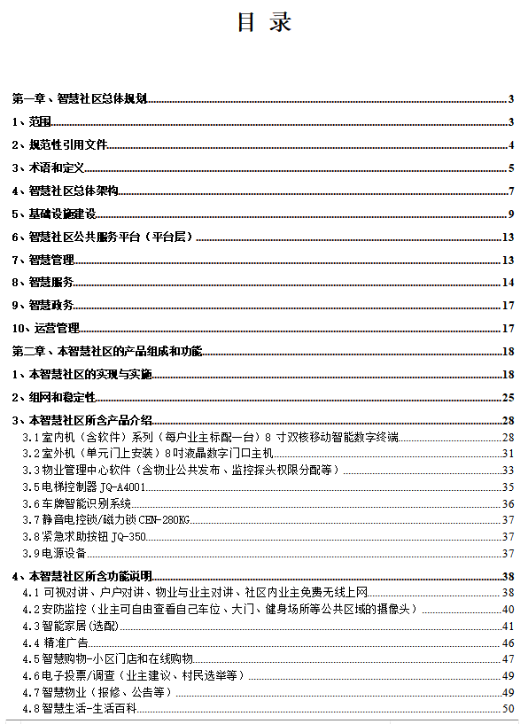 内容涉及的比较全面,详细的介绍了智慧社区的整体柜架、各系统组成、产品选型、功能结构、实现方式等,是智慧社区建设中非常好的参考内容,平时对这块不了解的朋友,可以参考这份拟定,下面是目录,我们来看下。