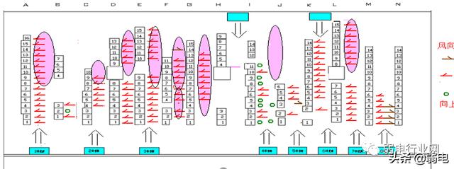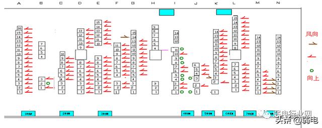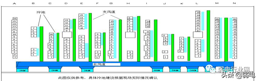 目前的机房中设备机柜摆放基本是正面朝向相同,(A~L列都是右面为正面、N和M列为面对面排列、其中也有排风方向相反和上排风的机柜)由于大部分的设备机柜是服务器,服务器设备自身有的散热系统是冷却风从机柜正面进,散热风从机柜背面出。