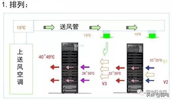 由于排列顺序的原因导致前排的机柜进风温度是后排机柜所排热风温度与空调送风口所送冷风温度的混和: