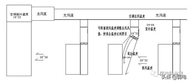 先将所有空调的出风口封闭做主风道,再做支风道,然后在支风道下每个机架前做引风道,在引风道下做出风口并加设送风风扇系统,此送风系统由6台风扇组成,其中有一台风扇做为备用(每个风扇的风量在220 M3/h);个别机柜的设备运行功率可能较大,可以改变风扇的数量或风扇的参数来满足要求。