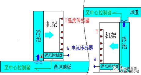 在机房内服务器机柜的排风口安装温度传感器,实时检测机房内机柜的出风温度,同时在有条件的机柜安装电流传感器,实时监控整个机柜的输出功率,再在机柜的送风口安装智能风量控制系统,根据以上检测的数据变化调节 每个机柜的送风量,满足服务器机柜的散热要求,避免局部温度过高。最后将所有数据传至中心控制器。