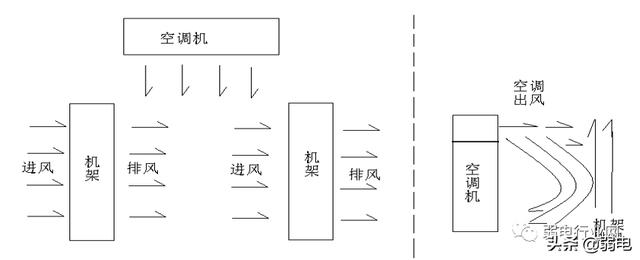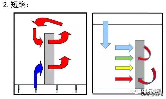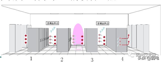 由于空调的排列问题导致有些机柜没有直接得到空调的冷量,而直接得到的是前排排风的热空气造成局部坏境过热。如:2排机柜,由于在空间中风在没有外力的情况下是不能转弯的,在2排机柜进风处冷风是很难到达的,它的进风温度基本上是3排机柜的排风温度,从而导致向这样机柜上的设备过热。