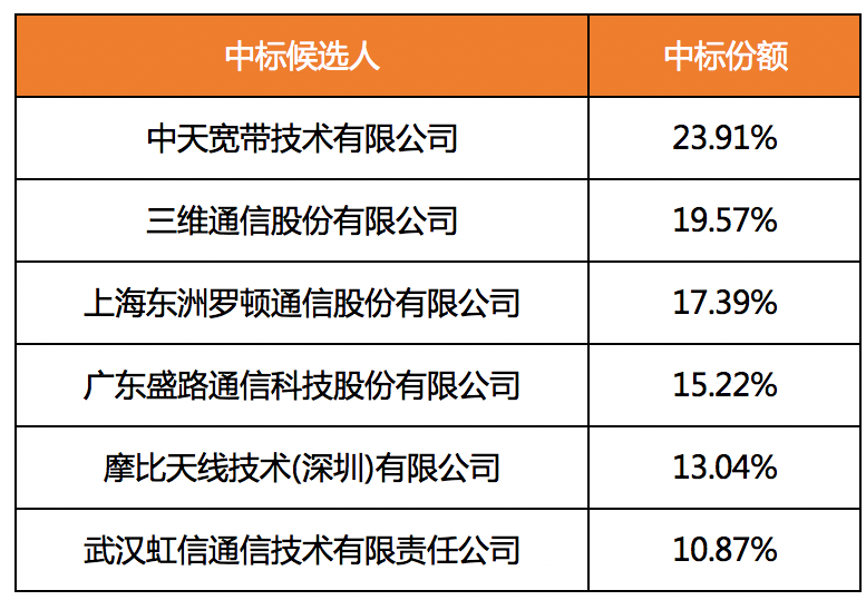 第1中标候选人:中天宽带技术有限公司,室内全向单极化吸顶天线投标报价为5.80元(不含税),中标份额为23.91%; 第2中标候选人:三维通信股份有限公司,室内全向单极化吸顶天线投标报价为5.80元(不含税),中标份额为19.57%; 第3中标候选人:上海东洲罗顿通信股份有限公司,室内全向单极化吸顶天线投标报价为6.20元(不含税),中标份额为17.39%; 第4中标候选人:广东盛路通信科技股份有限公司,室内全向单极化吸顶天线投标报价为6.40元(不含税),中标份额为15.22%; 第5中标候选人:摩比天线技术(深圳)有限公司,室内全向单极化吸顶天线投标报价为6.57元(不含税),中标份额为13.04%; 第6中标候选人:武汉虹信通信技术有限责任公司,室内全向单极化吸顶天线投标报价为7.11元(不含税),中标份额为10.87%。据悉,本次招标产品为室内全向吸顶天线、定向壁挂天线、定向窄波束天线共计3类9种产品,招标规模约为1244.02万面。不含税价格总价的最高限价为344,079,679.42元。