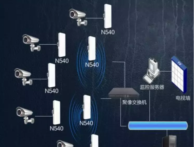 网桥设置方案解析:假设两个网桥为A和B,如图标识,A通过网线连接监控室中心,B通过网线连接到摄像头。(注:B点如果摄像头较多则需加装交换机)