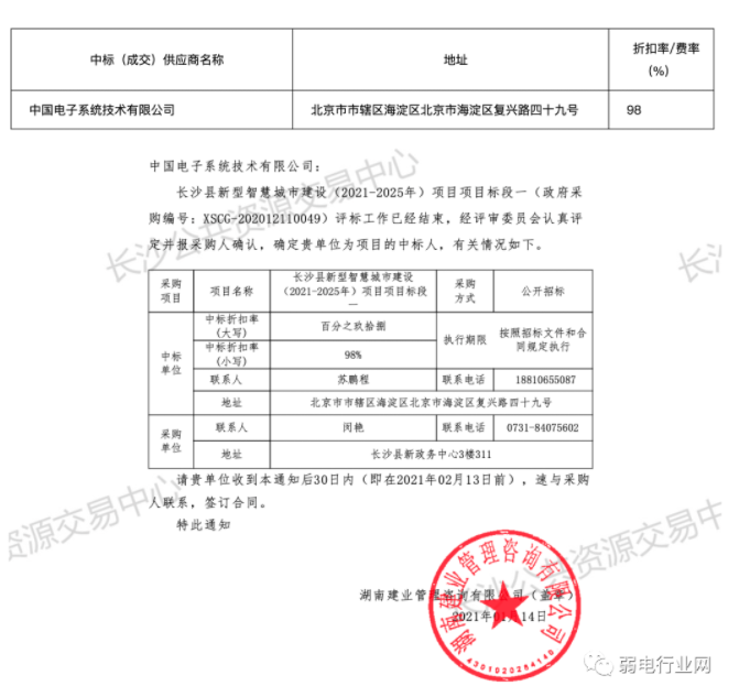 2021年1月14日中标公告发布,中国电子系统技术有限公司中标。